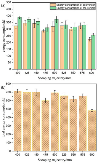 The measured front and rear drive shaft torque and engine output speed are brought into Equation (8), and the displacement, pressure, and radius of the bucket cylinder and moving arm cylinder are brought into Equations (9) and (10). The energy consumption of work performed by the cylinder and the energy consumption of work performed by the whole vehicle are obtained, respectively. As shown in Figure 19a, except for the trajectory with a parallel shoveling depth of 600 mm, the energy consumption of the work performed by the cylinder is between 288.9 kJ and 345 kJ, and the energy consumption of work performed by the whole vehicle is between 312 kJ and 388.5 kJ. The energy consumption of the work performed by the whole vehicle for each shoveling trajectory is higher than that of the work performed by the cylinder. Figure 19b shows the total energy consumption of the sum of the energy consumption of the work performed by the whole vehicle and the energy consumption of the work performed by the cylinder. The highest total energy consumption for the work was 713.5 kJ for the trajectory with a shovel depth of 400 mm. The total energy consumption for the work was also higher for shovel depths of 425 mm, 450 mm, and 500 mm, ranging from 693.7 kJ to 698.3 kJ. The operating energy consumption of the remaining trajectories is lower, except for the trajectory of the shovel depth of 600 mm; the total energy consumption of the remaining trajectories is between 600.8 kJ and 658 kJ.