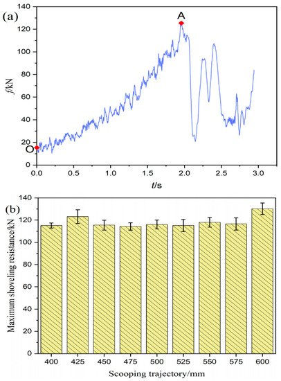(a) The operating resistance curve of the bucket in the horizontal shoveling phase; (b) the maximum operational resistance of the loader during the horizontal shoveling phase.