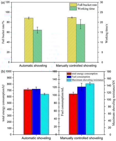 (a) Full bucket rate and operating time of automatic shoveling and manually controlled shoveling; (b) total energy consumption, fuel consumption, maximum operating resistance of automatic shoveling, and manually controlled shoveling.