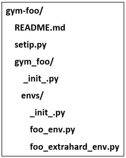 Custom OpenAI Gym Implementation. The official SMB Gym could not be used as we were feeding the synthetic environments from our GAN module to our RL agents. Hence, a custom Gym was required to be developed. Custom environments can be created in OpenAI Gym (Figure 5) by structuring the source for the custom Gym as a git repository for an installable pip package. The minimal required directory structure that enables Gym to recognize and provision custom environments is shown in Algorithm 1.