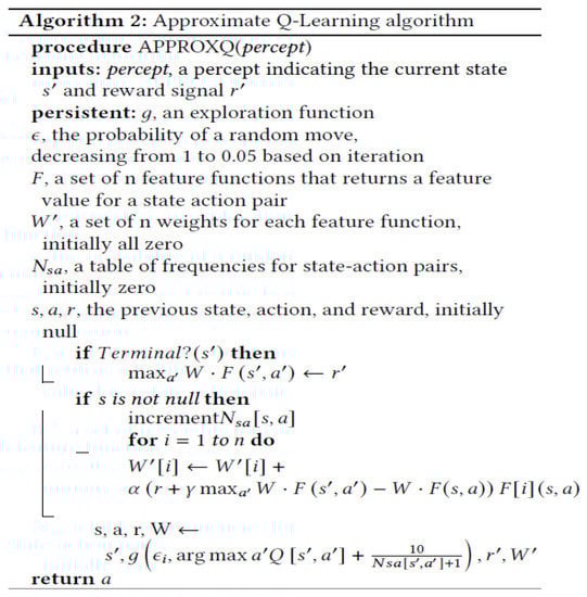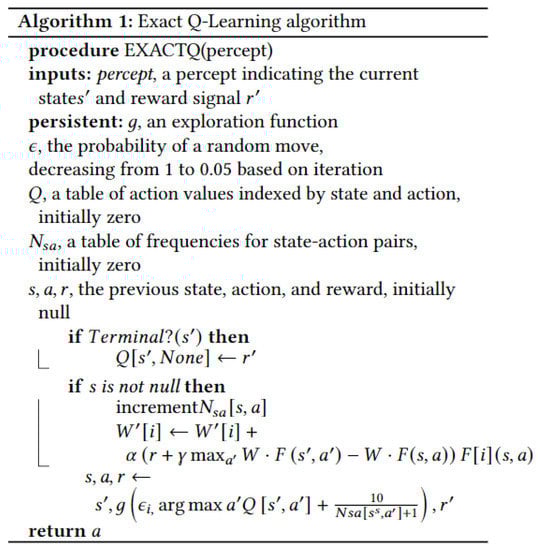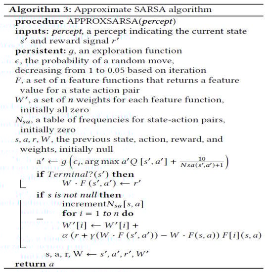 All of the attributes that we used for approximate algorithms are specified in Section 4.2.2. Now, we will understand how and when we updated the weights associated with each of those attributes. Whenever the agent gains any reward, the approx algorithm updates the importance (weights) associated with each of the attributes that are active at that particular moment. As we know that one state can only lead to a different state sequentially, credit must be given to both of the states, i.e., the present state as well as the state before that led us to this particular state. Thus, to sort this out, we included “eligibility traces” in our approx algorithms. Therefore, the approx Q-learning algorithm was converted to approx Q(), and the approx SARSA algorithm was converted to approx SARSA(). Therefore, now, the updating of weights associated with the attributes not only takes place on the basis of present state attributes, but the weights are also adjusted iteratively on the basis of the attributes associated with all of the states that our agent came across before the current state. was used for determining the magnitude corresponding to the update. Consider as the default update for the weight of feature i at time t. Then, our equation is: