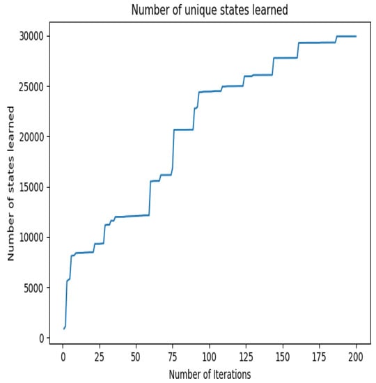After evaluating the results initially, our only concern was if the Q-learning agents had actually converged within the selected number of iterations for training into a good agent policy. We wanted to test for a much larger number of iterations for training, but, in terms of the computational resources available to us, it was the best we could carry out. Thus, we set out to quantify each agent’s learning for evaluating the convergence (Figure 10). We can look at the number of new states acquired during 200 training iterations by the exact Q-learning agent in Figure 6. We find an approximately linear increase in this number for approx. 200 iterations. We understood that 100 iterations was indeed not enough for the exact Q-learning agent (Figure 11).