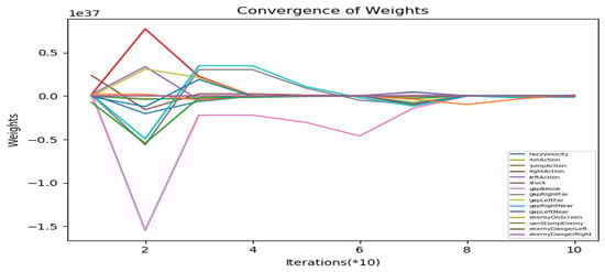 The weights for each feature usually converged for the approx Q-learning agent in under 100 iterations. This could possibly be due to Mario dying in between relatively frequently. It depicts notable fluctuations in the initial cycle of learning. A long stabilization then follows. From these findings, we concluded that additional training iterations for the approx Q-learning agent would not likely have provided a substantial improvement in the performance (Figure 12).