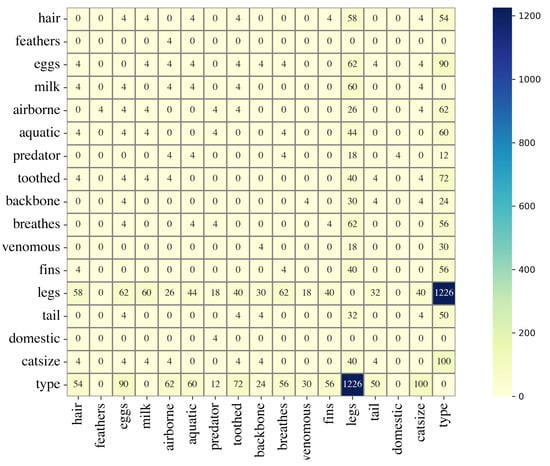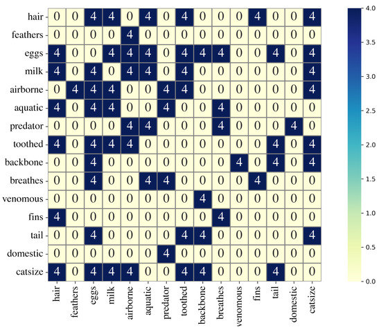 - Zoo data set was created by Richard Forsyt, and it is publicly available on https://archive.ics.uci.edu/ml/datasets/Zoo (accessed on 1 December 2022). The data set has 16 features. Each sample is assigned to one out of seven classes or types. The name of the animals is also given.