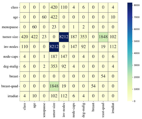 The Breast Cancer data set contains variables of type interval; these are age, tumor-size and inv-nodes; the variable deg-malig has values 1, 2 and 3. The rest of the variables are of type categorical. All non categorical features were transformed into categorical ones. Figure 5 shows the results obtained by the application of the method. It is noticeable that for this data set, the computation time was more than 7 min on a MacBook Pro, Apple M1 processor with 8 GB RAM.