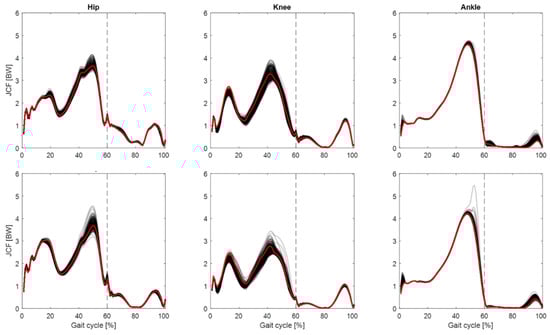 The simulation of 200 variations of the baseline SGM and SSM led to the JCF curves plotted in Figure 2. JCFs from the baseline models were always within the range obtained from the 200 variations of each model. The sampling of Fmax led to variations of JCFs up to 0.8 BW, 1.1 BW, and 1.7 BW with SGM and up to 1.4 BW, 1.2 BW, and 2.1 BW with SSM for hip, knee, and ankle, respectively. These always occurred during late stance peak and corresponded to 21%, 33%, and 20% (SGM) and to 38%, 104%, and 59% (SSM) of baseline value for the hip, knees, and ankles, respectively.