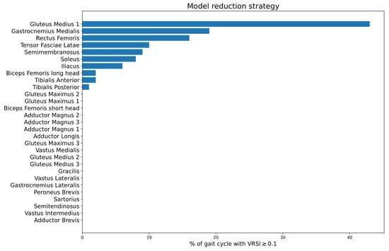 Percentage of gait cycle where VRSI ≥ 0.1 for the muscles included in the analysis. The chosen model reduction strategy prioritises the personalisation of muscles at the top of the plot, where VRSI is above 0.1 for a larger percentage of gait cycle.