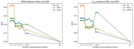 Similarly to RMSD, Δmax between SSM and SSMm’s JCFs were always small (up to 0.2 BW). A value of 0.2 BW of difference was found at the knee when no muscles were personalised. This dropped to 0.07 BW with the personalisation of 9 muscles. Similarly, hip Δmax dropped from 0.14 BW to 0.06. At the ankle joint, the behaviour was more complex, with an initial reduction in Δmax followed by a steep increase first, and then a final decrease.