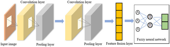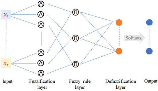 An FNN combines the logical reasoning of humans and the learning abilities of neural networks. FNNs have been successfully used in classification systems [30,31]. Figure 4 illustrates the architecture of an FNN, which primarily contains a fuzzification layer, fuzzy rule layer, and defuzzification layer. Fuzzy rules are inferred using IF–THEN representations. These rules are expressed as follows: