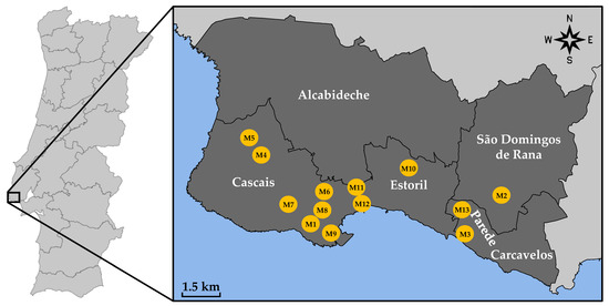 Locations of the 13 studied GSs in the Cascais municipality (delimitation defined by dark grey area), within the Lisbon metropolitan area.