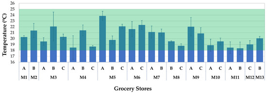 Figure 2 represents the mean levels of temperature assessed in the studied GSs during the working period, where the mean temperature level was 20.4 ± 1.2 °C, ranging from a maximum value of 23.8 ± 0.8 °C (GS M5, Location A) and a minimum of 18.4 ± 1.1 °C (GS M11, Location B).