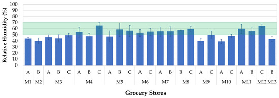 ISO 7730 establishes the optimal RH range to be between 30% and 70% [32]. Considering this range, all the studied GSs presented mean RH levels within the acceptable range. However, the Portuguese Decree-Law nr 243/86 of 20 August—Article 11th [31] establishes that the relative humidity range in workplaces, as well as common facilities, should be between 50 and 70% (green area of Figure 3). Considering this range, 7 out of 13 GSs (53%) presented mean values within this range, while the remaining GSs were always below the lower recommended limit value of 50% (M1, M2, M3, M9, M10, and M13).