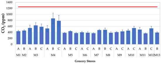 CO2 levels assessed in all locations of the studied GSs. The red line represents the limit value of 1250 ppm established by Portuguese legislation [34].