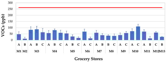VOC levels assessed in all locations of the studied GSs. The red line represents the limit value of 262 ppb established by Portuguese legislation [34].