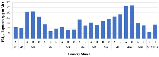 The exposure to and the associated potential inhaled dose of PM in the GSs during working hours (8 h) are described in Table 2. Exposure to PM10 and PM2.5 were estimated to be 170.0 ± 57.4 μg.m−3.h and 161.7 ± 58.7 μg.m−3.h, respectively. Figure 8 presents PM2.5 exposure levels of workers at all studied locations of the GSs, considering a working period of 8 h.