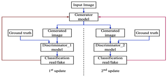 Algorithm 2 Our proposed algorithm to update generator G with two different discriminators ( D 1   and D 2 )