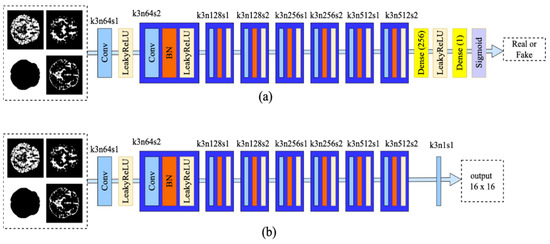 For the discriminator based on a conditional GAN, we follow the summarized architecture by [15]. This architecture avoids the use of max pooling. The maximization problem in Equation (1) is solved by training the discriminator network [20]. There are eight convolutional layers increasing from 64 to 512 by a factor of 2; the same as in the VGG architecture [30]. To reduce the resolution when the feature numbers are doubled, stride convolutions are used. We use LeakyReLU as the activation function (α = 0.2). The final feature maps are followed by two dense layers and then by a sigmoid activation function, which provides a probability for the classification. Figure 4a illustrates the architecture of this conditional GAN. The task of the discriminator is to examine the output of the generator and determine whether it is similar to the original ground truth or not. If it is comparably similar to the ground truth, it will predict it as “real”, otherwise it will be “fake”. Hence, the generator will consider this loss to generate images similar to the ground truth as much as possible. The discriminator in Figure 4a functions like a binary classifier where real is represented by true and fake is represented by false.