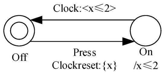 Figure 1 shows a Timed Automaton example which is a switch, where the initial state is Off. When the event Press occurs, the system transits to the state On and resets the clock x. Because of the state invariant on the state On, the system must transit to the state Off in two time units.
