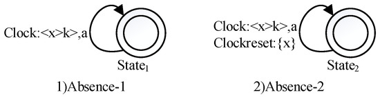 - Name of property pattern: AbsenceProblem to be solved: An event must not occur within a certain amount of time.Solution: The patterns Absence-1 and Absence-2 are shown in Figure 2. For the self-transition in Absence-1, there is a clock constraint x > k which means that event a can only occur after k time units. The difference between Absence-2 and Absence-1 is whether the clock x is reset on the self-transition, which means that the time between two occurrences of event a must be larger than k time units. Event a may occur many times and also may never occur because there is no state invariant on or .