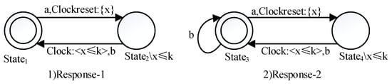 Figure 4. Property pattern of Response. - Name of property pattern: PrecedenceProblem to be solved: An event must always be preceded by another event within a certain amount of time.Solution: The patterns Precedence-1, Precedence-2, Precedence-3 and Precedence-4 are shown in Figure 5. Precedence-1 denotes that when event a occurs, the clock x is reset to zero. After that, if event b occurs, it must not be within k clock units, during which event a may continue to happen multiple times because of the self-transition on . Precedence-2 denotes that after event a, if event b occurs, it must be within k time units, during which event a can also occur many times. Precedence-3 and Precedence-4 are similar to the above. The only difference is that the occurrence time point of event b is related to the last occurrence of event a due to the clock resetting on the self-transitions from and .