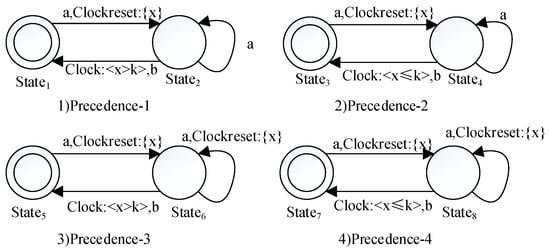 - A set of transitions is represented by as follows. For any and any transition in , the is added into . For any , the corresponding name of the clock in is ; for any , the corresponding one in is . For any , if , then ; otherwise, . The pending R will be explained in step c.