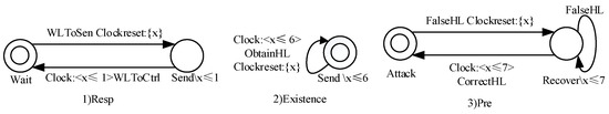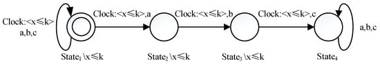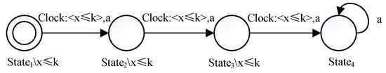 Firstly, some related definitions for timed automata [1] are given. Let C be a set of clocks, and be a set of clock constraints. A clock constraint is defined as follows: , where , where x is a clock in C and n is a non-negative integer. The set of downward constraints obtained with is denoted as . A clock valuation v for a set of clocks C is a function which assigns a real value to each clock. If the clock valuation v makes the clock constraint true, then v satisfies based on . For any , let denote the clock valuation such that for all . For a set of clocks , let the clock resetting notion denote the valuation such that for any and for all .