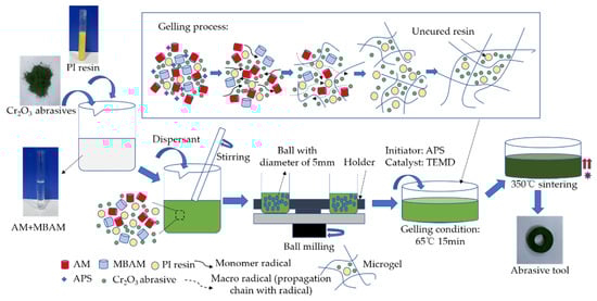 In this paper, the sol–gel method was used to prepare the abrasive tool. Polyacrylamide gel has a good three-dimensional network structure, and its gelation process is a typical free-radical polymerization reaction, which is the result of one branched structure diffusing and apportioning the entire space in the gel system [25]. The mixed solution of bulk acrylamide (AM) and crosslinking agent methylene bisacrylamide (MBAM) has low viscosity, which is conducive to the dispersion of inorganic particles in it. Thermosetting polyimide resin has the advantages of good mechanical properties and high temperature resistance. Wu et al. [26,27,28] found through experiments that, when using Cr2O3 as an abrasive to process sapphire, the solid-phase chemical reaction of the two was strong due to the similar crystal structures of hexagonal crystals of chromium oxide and aluminum oxide; therefore, Cr2O3 was selected as the experimental abrasive. The slurry needs to be ball-milled and dispersed before initiation. The gel wraps abrasives and fillers in the initiation process to form a green body and is sintered at 350 °C to form an abrasive tool.