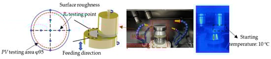 The MicroXAM 1200 white-light interferometer from Taiwan China was used to test the micromorphology and surface roughness of the workpiece after polishing. Ten points were taken along two vertical diameter directions, and the flatness was measured using HSINTEK AK100F3 laser interferometry from Taiwan China. The measurement method is shown in Figure 2. The KEYENCE CL-3000 laser displacement sensor from Japan (accuracy 0.25 µm) was used to achieve precise measurement of the workpiece grinding depth; the Fluke Thermal imaging camera from U.S. was used to observe the thermogram.