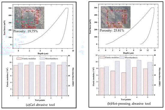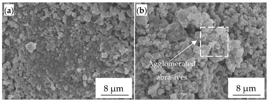 Figure 3 shows the SEM microtopography of the gel abrasive tool and the hot-pressing abrasive tool. The agglomerated abrasives can be observed in the micrograph of the hot-pressing abrasive tool. On the one hand, the preparation method of the hot-pressing abrasive tool involves dry mixing, whereby the fluidity of the mixed materials is much worse than that of the wet mixing method. Furthermore, there are density differences between different materials, which renders the mixing process more difficult. On the other hand, the abrasives have a high surface energy and large contact surface due to the small particle size, whereby agglomeration is prone to happen due to van der Waals forces between the particles. It can be observed from Figure 3a that abrasives were uniformly dispersed in the gel abrasive tool because the premixed solution of the gel abrasive tool had low viscosity. Moreover, under the action of chemical reagents such as the dispersant and wetting agent, the abrasive had a better dispersion effect. Pore structure is an important feature of abrasive tools; Archimedes’ principle was used to test the density and porosity of samples. The porosity of the abrasive tool can be obtained by calculating the theoretical density and weighting dry weight, floating water weight, and water weight of the sample. The existence of pores in the abrasive tool enables the abrasive tool to have good debris-holding and heat-dissipation capabilities. It can be seen that there were many uniformly distributed pores on the surface of the gel abrasive tool, which were caused by the loss of water during the drying process.