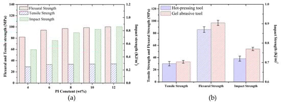 (a) The influence of PI resin content on the mechanical properties. (b) A comparison of the mechanical properties of the gel abrasive tool and hot-pressing tool.