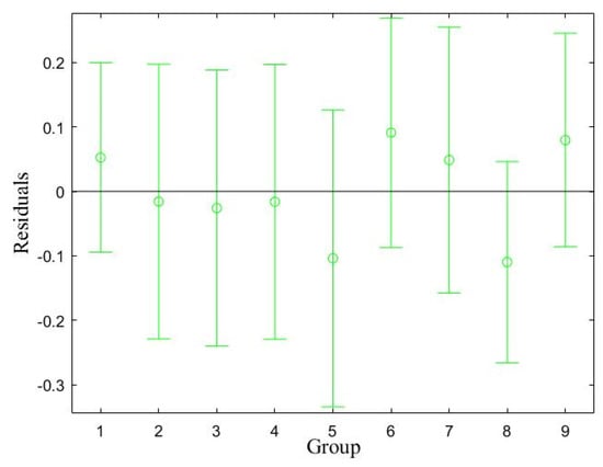 The orthogonal experiment results were introduced into the formula, and the regress function in the MATLAB was used to calculate the surface roughness residual map and the indices C, b1, b2, and b3. The results are shown in Figure 6. The points in the figure represent the residuals of the data, and the line segments represent the confidence intervals. It can be seen that each point was relatively close to the zero line, and the confidence intervals all included the zero-point line, indicating that the model could predict the surface roughness of sapphire. The indices calculated using the regress function were as follows: C = 1.0857, b1 = −0.0890, b2 = 0.1580, and b3 = 0.4052; therefore, the prediction model could be expressed as