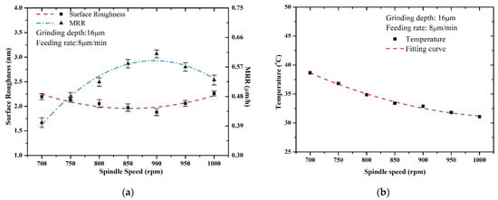 Influence of spindle speed on the (a) surface roughness, MRR, and (b) machining temperature (average temperature in the contact area after machining for 5 min).