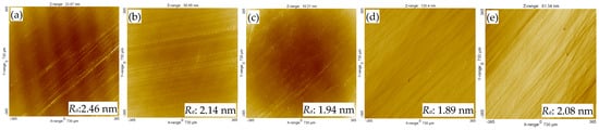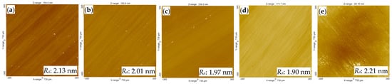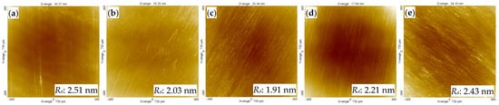 Surface topography of sapphire under different spindle speeds: (a) 750 rpm; (b) 800 rpm; (c) 850 rpm; (d) 900 rpm; (e) 950 rpm.