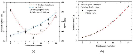 Influence of feeding rate on the (a) surface roughness, MRR, and (b) machining temperature (average temperature in the contact area after machining for 5 min).
