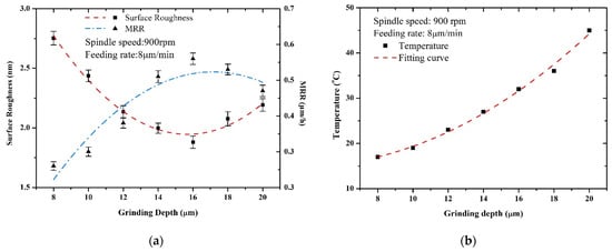 Influence of grinding depth on the (a) surface roughness, MRR, and (b) machining temperature (average temperature in the contact area after machining 5 min).