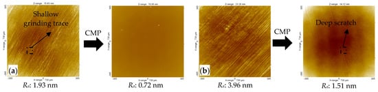 Surface topography of the sapphire after machining using different tools and after CMP: (a) gel abrasive tool; (b) hot-pressing abrasive tool.