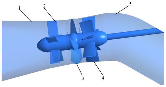 Flow channel diagram. (1) Inlet channel, (2) front guide vane, (3) runner, (4) guide vane, (5) outlet channel.