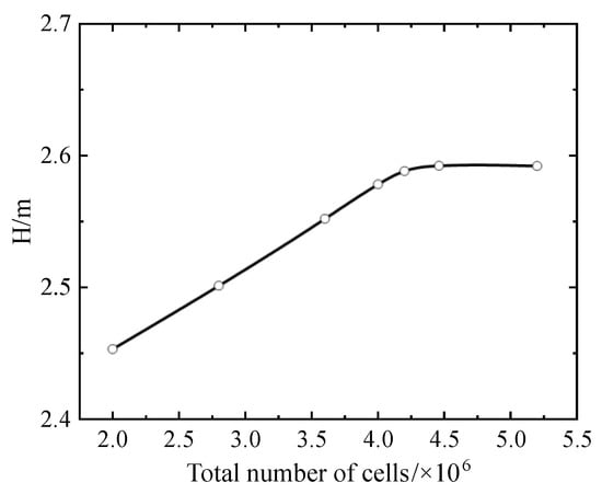 For the accuracy of the calculated values and the rational use of computing resources, a total of 7 grids with different grid numbers were designed using ICEM software, and the design water head was selected as the reference to verify the grid independence. As shown in Figure 2. The fluctuation error of the head was already within 1% when the number of elements reached 4.1 million. When considering factors such as computing resources, the final selection grid was 4.32 million. Of them, the impeller area was 2 million, the front guide vane area was 700,000, the rear guide vane area was 800,000, the inlet section was 600,000, and the outlet section was 300,000. The grid of some overflow parts is shown in Figure 3.