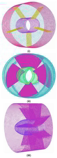 Meshing of the axial-flow pump fluid domain. (i) Front guide vane area. (ii) Turbine blade region. (iii) Active guide vane region.