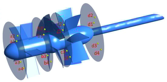 Figure 4 shows the setting of the monitoring points of the computational model. In the figure, four monitoring surfaces were set, which were located at the inlet of the front guide vane, the inlet, and outlet of the runner chamber, and the outlet of the movable guide vane. A total of 16 monitoring points were set that can monitor the changes in the pressure pulsation on different interfaces in more detail. On different monitoring surfaces, the monitoring points were distributed along the radial direction, and the angle between the two groups of monitoring points was 90°. Among them, the monitoring points a2 and b3 were located at the outer edge positions of each monitoring surface, which was consistent with the monitoring positions of the test arrangement.