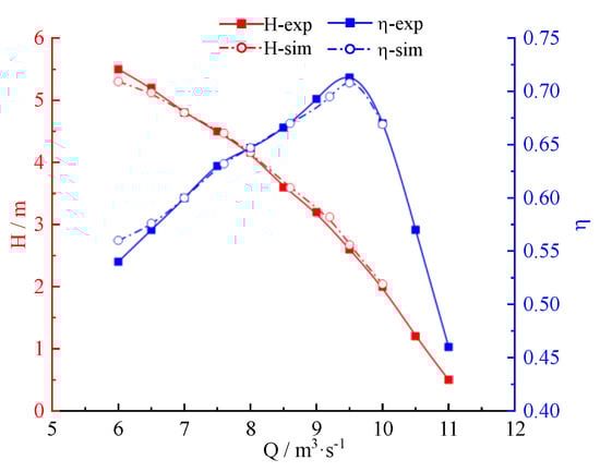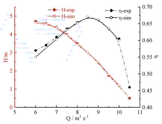 Several operating points under the pump condition and the turbine condition were selected to verify the accuracy of the numerical simulation, and the external characteristic curve obtained by the numerical simulation was drawn. Figure 5 and Figure 6 show the external characteristic curves of the pump under forward and reverse working conditions respectively. Compared with the characteristic curve of the prototype unit obtained from the experiment, it can be found that there is a certain deviation in the efficiency at low flow rate, the maximum deviation was within 3%, and the head was slightly lower than the experimental result. Considering the deviation of the calculation model and the local structure of the prototype pump and the influence of the number of meshes, some deviations in the numerical simulation results were inevitable. In general, the deviation between simulation results and experiment is small, and the trend is the same for both. Therefore, the numerical simulation results in this paper have a certain credibility.