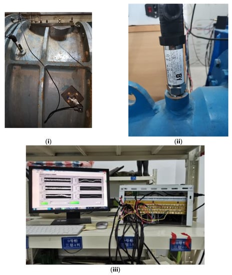 Figure 7 shows the site layout during the test of a pumping station, including the layout of the monitoring points, the selected pressure pulsation sensor, and the on-site measuring instruments. Restricted by the natural environment and working environment, the real machine test selected the test when the speed was 250 r/min. Since the real machine test could not open holes at random in the unit, according to the characteristics of the unit itself, holes were opened at the front end of the front guide vane and the front end of the runner to conduct the pressure pulsation test. During the test, we ensured that the pressure sensor was placed vertically with the pipeline. In this paper, the HPT900 high-frequency dynamic pressure sensor provided by Kunshan Yubin Electronic Technology Co., Ltd. was selected, with an accuracy of 0.5%. The pressure sensor arrangement is shown in Figure 7ii.