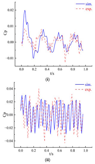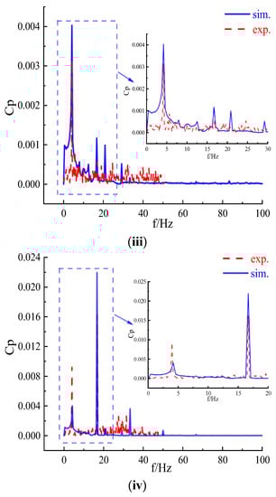 The pressure pulsation was measured by the real machine test, the monitoring points were arranged at the outer edge of the inlet position, and the numerical simulation results were compared with the measured values of the real machine test. The comparison results are shown in Figure 8, which contains the time-domain and frequency domain graphs of the pressure pulsation obtained from the experiment and numerical simulation, respectively. It can be seen from the figure that the results of the real machine test were in good agreement with the results obtained by the numerical simulation. Figure 8i,ii show that there was still a certain error between the test and the simulation, and there was a certain difference in the amplitude when changing with time. It can be seen from Figure 8iii,iv that the frequency domain distribution of the pressure pulsation obtained by simulation was basically the same with the test. Among them, the main frequency at the leading position was the rotation frequency; the frequency at the inlet of the runner was the BPF, and the rotation frequency was twice the secondary frequency. Considering that there may be a little deviation in the position of the monitoring points, the influence of the elements on the results and the related disturbances on the site may have caused deviations in the results, but the deviation of the amplitude was within 5%, which was within a reasonable range and acceptable error. Therefore, we considered the numerical simulation results to be consistent with the experiments, and the numerical simulation results were trustworthy.