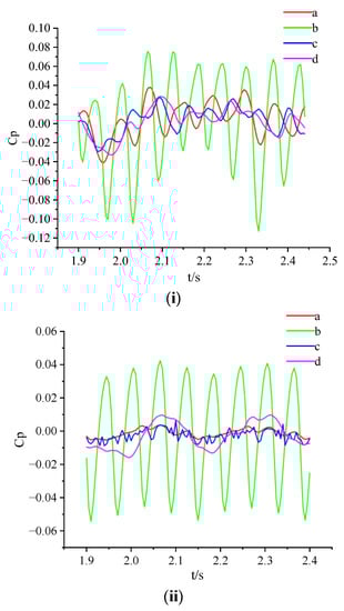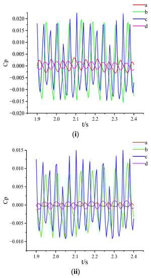 Time–domain diagram of the pressure pulsation under turbine conditions. (i) 0.6Q. (ii) 1.0Q.