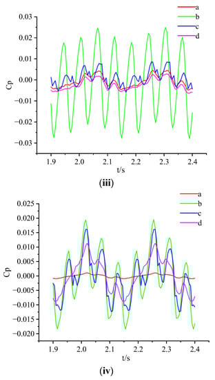 Time–domain diagram of the pressure pulsation under pump conditions. (i) 0.6Q. (ii) 0.8Q. (iii) 1.0Q. (iv) 1.2Q.