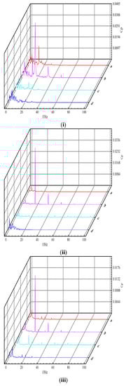 It can be seen from the figure that when the unit was running under the pump condition, under different flow conditions, the frequency at the inlet of the runner was the BPF and its multiplier, in which the main frequency was the BPF, and the secondary frequency was the rotation frequency. Under the design flow condition and the large flow condition, the primary and secondary frequencies of the pressure pulsation frequency distribution of each monitoring surface were obvious, and there was no obvious clutter. Under the small flow condition, however, especially deviation from the design flow under the low flow condition in the low frequency band, there were a many secondary frequencies and clutter, the spectrum was extremely complex, and there was no obvious main frequency, indicating that the internal flow state of the unit was poor at this time, with serious decurrent, backflow, etc. Comparing the frequency domain diagrams under different flow conditions, it can be found that on the monitoring surface of the runner chamber, the main frequency was the BPF, and when it was far away from the runner chamber, the main frequency was the rotation frequency. This indicated that the dynamic and static interference area was obviously affected by the rotation of the blades, while in the non-blade area, it was mostly influenced by the rotation.