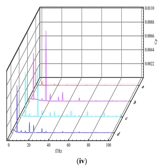Frequency domain diagram of the pressure pulsation under pump condition. (i) 0.6Q; (ii) 0.8Q; (iii) 1.0Q; (iv) 1.2Q.