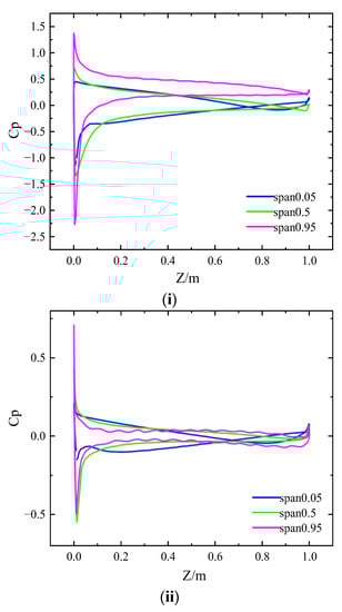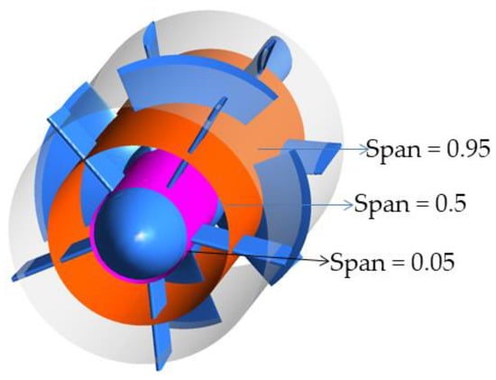 For studying the pressure coefficient distribution along the blade at different blade heights in the runner chamber and the flow velocity distribution in the impeller and guide vane areas, three annular sections with different blade heights were chosen from the hub to the rim in the runner and guide vane areas. The span values were 0.05, 0.2, and 0.95, representing near the hub, the mid-section of the blade, and near the rim, respectively, as shown in Figure 13.