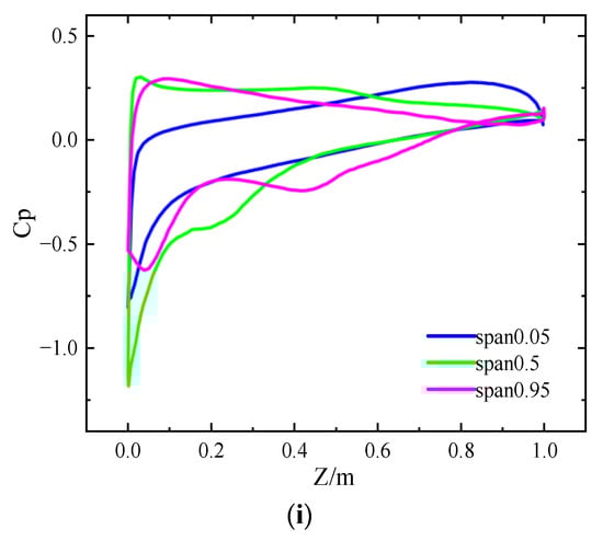 When operating under the turbine condition, as shown in Figure 15, under a different flow condition, the distribution trends of the pressure coefficient Cp curves at different blade heights were consistent. Under low flow conditions, the overall distribution of the pressure coefficient Cp near the rim was higher than that at the hub and the middle of the blade. As the flow rate increased, the value of the blade surface pressure coefficient Cp also decreased, indicating that under the design flow condition, the pressure variation on the entire blade was small, and the flow state was more stable at this time.
