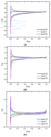 Figure 14 and Figure 15 are the distribution diagrams of the pressure coefficients at different blade heights under pump and turbine conditions, respectively. The horizontal axis Z represents the distance along the axis, and the vertical axis Cp represents the pressure pulsation coefficient. Considering that the four runner blades of the research object in this paper were exactly the same, only the data on one blade were selected for separate study when considering the pressure coefficient distribution at different blade heights. In the figure, except for small flow conditions, when operating near the design flow, the pressure coefficients at different blade heights were basically the same along the blade distribution trend. With the increase in the span value from the hub to the rim, the pressure coefficient also increased, and under the small flow rate condition, the distribution curve of the pressure coefficient Cp at different blade heights changed greatly, indicating that the change in flow had a larger influence on the flow field. When the flow rate was low, the flow state of the internal flow field was poor, the energy loss was serious, and there were even de-flow and backflow phenomena at the blade. Therefore, the pressure coefficient curve along the blade surface changed greatly.